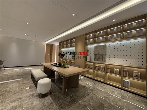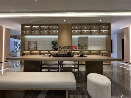 今天分享的是盐池望远民生售楼部展厅装修设计实景,该家售楼部展厅装修设计方面主打的是轻奢自然风,精准打造出一个具有魅力的展厅形象。空间布局上,成品完美体现了售楼部展厅装修设计的功能优先级:靠窗区域做了“观景式洽谈区”,长条形卡座+小边几的组合,既利用窗外绿植弱化了商业属性,又通过嵌入式灯带营造出“家的松弛感”——这是银川装修公司镹臻常用的“场景代入法”,让客户在洽谈时提前感知“未来生活场景”。同时,分散式的座椅布局兼顾了私密性,避免了传统售楼部的拥挤感,也符合银川高端售楼部“低密度、舒适化”的设计趋势(如阅海湾壹号展厅的松弛感营造)。